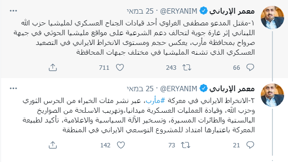 שר ההסברה של תימן – מועמר אל-אריאני – אמר כי מותו של אל-ר'ראוי, אחד ממפקדי חזבאללה, "משקף את מידת המעורבות האיראנית בהסלמה הצבאית מצד המיליציות החות'יות בכל החזיתות… מעורבות זאת באה לידי ביטוי בשיגור מאות מומחים ממשמרות המהפכה האיראניים וחזבאללה, בפיקוד על פעולות צבאיות בשטח, בהברחת טילים בליסטיים וכטב"מים, ובגיוס המנגנון הפוליטי וההסברתי לטובת פרויקט ההתפשטות האיראנית באזור." אל-אריאני קרא לקהילה הבין-לאומית, לאו"ם ולחברות הקבועות במועצת הביטחון לפרסם עמדה נחרצת נגד ההתערבות האיראנית הבוטה בענייניה הפנימיים של תימן. הוא הטיל על איראן את האחריות המלאה "להסלמה הצבאית, לטרפוד המאמצים להשיג רגיעה בדרך להשכנת שלום, להמשך הקזת הדם ולסבל ההומניטארי של תושבי תימן."[1]