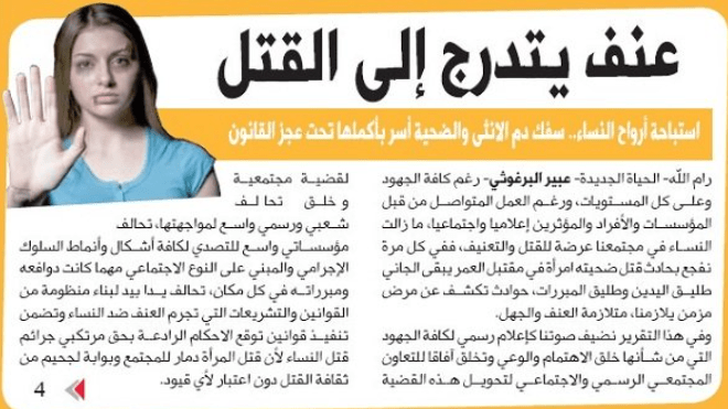 לפי הכתבה של עביר אל-ברגותי ביומון הרש"פ אל-חיאת אל-ג'דידה, למרות כל המאמצים ובכל הרמות ולמרות העשייה המתמשכת של מוסדות ואנשים בעלי השפעה בתקשורת ובחברה, הנשים בחברה הפלסטינית חשופות לרצח ולאלימות. "בכל פעם אנו מזדעזעים מאירועים של רצח שהנשים הן הקרבנות והפושעים פועלים בחופשיות בתירוצים שונים. מדובר במחלה כרונית ותסמונת של אלימות ובערות."