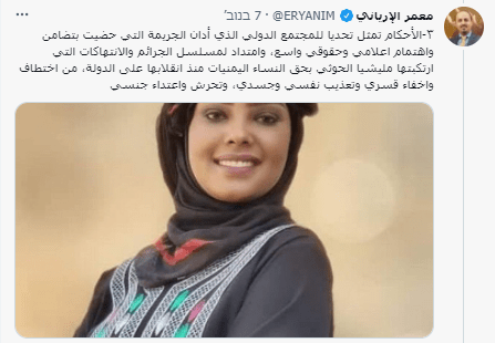 אל-אריאני קרא לקהילה הבין-לאומית, לאו"ם, לארגוני זכויות האדם ולארגונים להגנת נשים ללחוץ על החות'ים שישחררו את השחקנית אנתצאר אל-חמאדי ועמיתותיה ואת כל הנשים העצורות ולהעניש את כל המעורבים בפשעים נגד נשים בתימן.