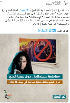 בהקשר זה, דיווח היומון אל-קודס אל-ערבי כי תושבים ירדנים קראו להחרים את הסרט "מוות על גדות הנילוס" בכיכובה של השחקנית הישראלית – גל גדות – "שהשמיעה הצהרות שנויות במחלוקת בתקופת ההתקפות של ישראל על עזה והתגאתה בשירותה בצבא הישראלי".