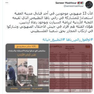 באחד הציוצים של תושבים ירדניים נכתב: "הפסיקו את מירוץ ראלי באהא. הנרמול עם ישראל הוא בגידה."