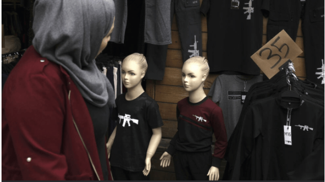 פלסטינית בשנות הארבעים לחייה, שבחרה להישאר בעילום שם, אמרה כי "בנה בן החמש הוא שביקש ממנה שתקנה לו את החולצה עם הציור של הרובה." היא הוסיפה כי הסיבה לביקוש הוא "מה שהילדים רואים בטלוויזיה בכל יום."