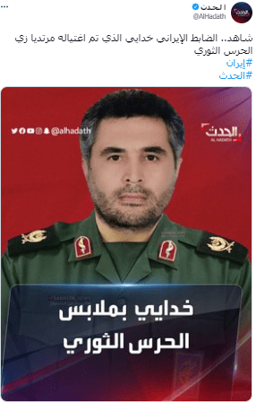 מחלקת יחסי הציבור של משמרות המהפכה באיראן אישרה את הידיעה על חיסולו של ציאד ח'דאי, קצין בדרגת עקיד (דרגה המקבילה לאלוף משנה) בכוח אל-קודס של משמרות המהפכה האיראניים. אלמונים רכובים על אופנוע ירו בו חמישה כדורים ליד ביתו באחת הסימטאות המובילות לרחוב מג'אהדי אל-אסלאם במזרח טהרן. רעייתו היא שמצאה אותו מתבוסס בדמו ודיווחה על האירוע.[1] לפי סוכנות הידיעות של משמרות המהפכה "תסנים", שמו של האיש הוא ציאד ח'דאירי.[2]